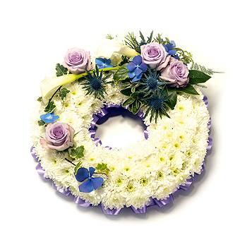 Based white Chrysanthemum open round wreath including Roses, Hydrangea and Eryngium with complementary foliage. Size: Diameter - 31cm (12").