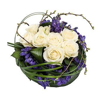 A stunning posy pad of white and cream Roses neatly nestled with purple Aconitum. Aspidistra leaves and Lily grass foliage complete the design.