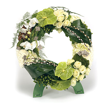 A contemporary white Phalaenopsis Orchid wreath featuring cream Roses, white Hydrangea and Carnations, green Chrysanthemums, Anthurium and Hypericum. Asparagus Fern, Aspidistra leaf, Pussy Willow, Bun Moss and Pine Cones complete the design.
