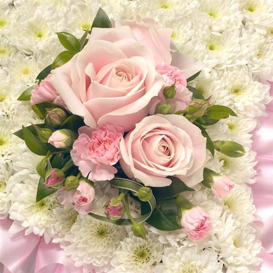 A classic white Chrysanthemum based pillow with ribbon edge. Featuring Roses, Carnations, Hypericum and complementary foliage. Size: Height - 33cm (13") Length - 51cm (20").