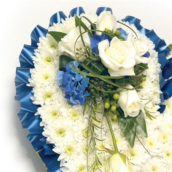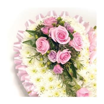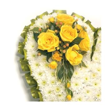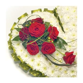 Classic white Chrysanthemum based heart shaped tribute with Roses, Freesia & Hypericum and complementary foliage edge. Size: Height - 33cm (13") Length - 33cm (13").